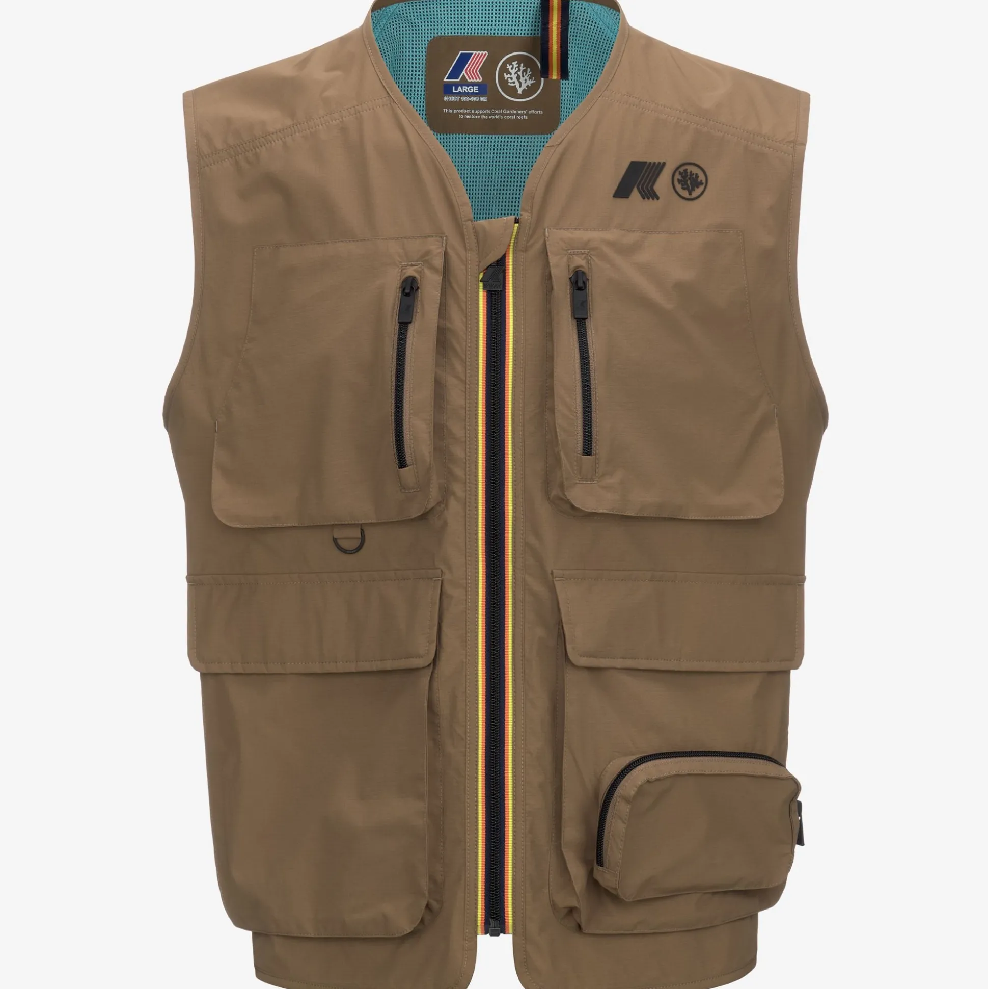 Allos è un gilet realizzato in tessuto nylon ripstop riciclato dalla vestibilità regolare che agevola i movimenti e la ventilazione durante l’attività sportiva. L’attenzione ai dettagli funzionali è confermata dalla chiusura con zip e dalle pratiche tasche, ideali per riporre i piccoli oggetti indispensabili durante le uscite sportive.Fodera interna in mesh colore azzurro.Personalizzato con il logo K-WAY x CORAL GARDENERS.