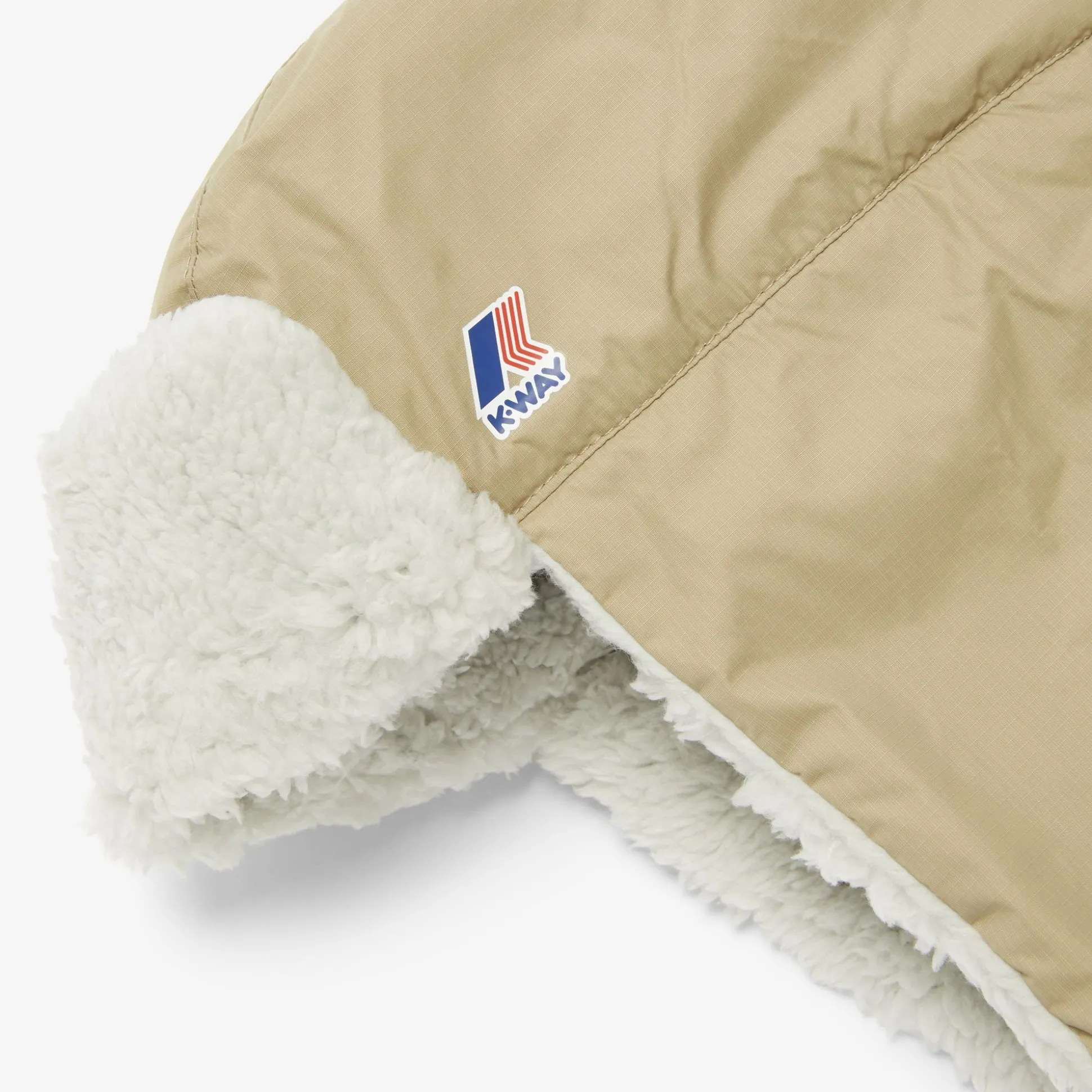 Cappello unisex in nylon Ripstop imbottito idrorepellente, traspirante, antivento con fodera interna in orsetto su visiera e paraorecchie. Regolazione sotto-mento con fibbia. Logo K-Way stampato. Etichetta QR label interna.