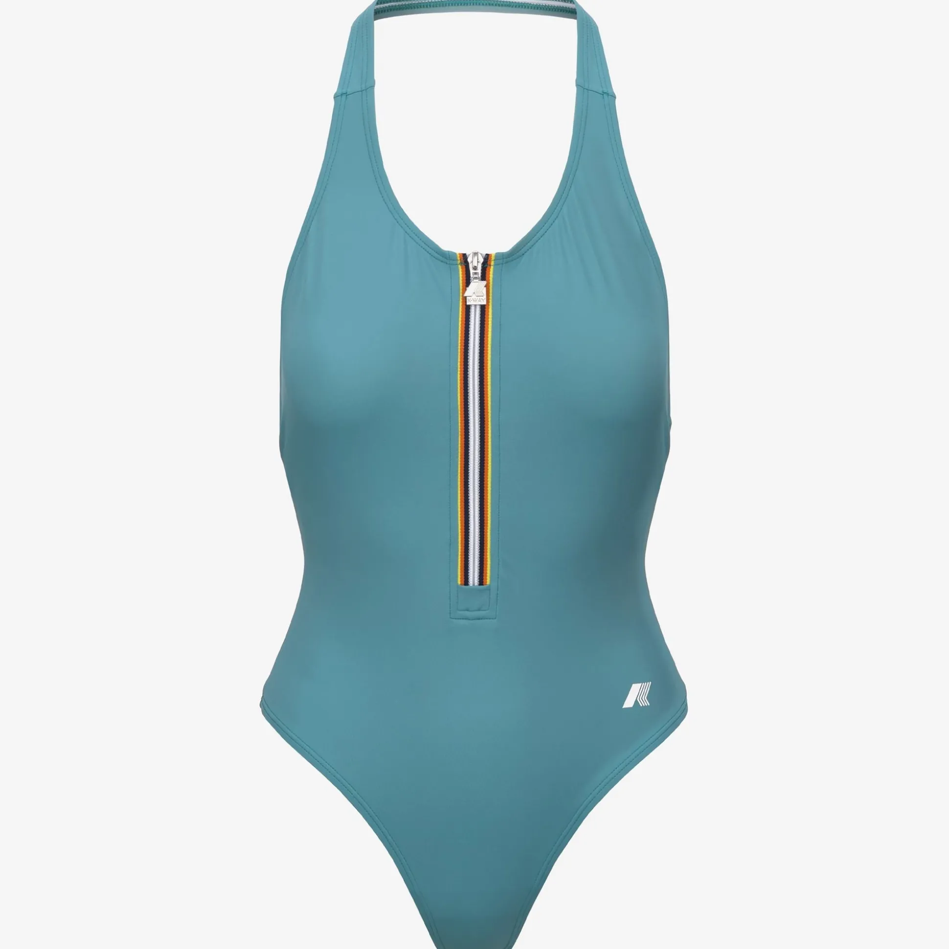 Il costume intero Sylvie ha una linea slanciata e femminile con scollatura all’americana e lunga zip sul davanti decorata con l’iconico tape multicolor. Realizzato in Lycra® resistente e ad asciugatura rapida, con il logo K-Way bianco sul fianco che aggiunge un dettaglio grafico elegante.