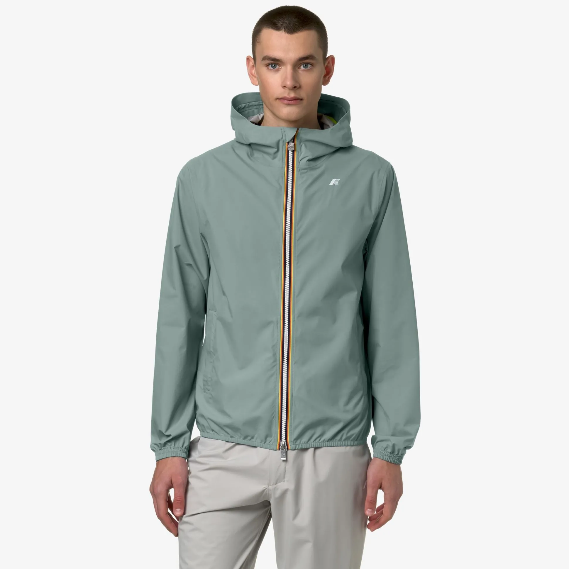 Jack è una giacca corta da uomo ideale per le mezze stagioni e con vestibilità slim, realizzata in tessuto tecnico elasticizzato e riciclato, che segue i movimenti e protegge dal vento e dalla pioggia fino a 5000 colonne d’acqua. L’interno è foderato con una membrana isolante decorata con lettering K-Way stampato all over in tonalità argento. Le tasche laterali con zip, il cappuccio avvolgente, i polsini e i bordi con inserti elastici sono dettagli funzionali che garantiscono aderenza e una vestibilità comoda e veloce.